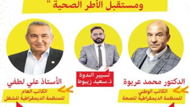 الجديدة تحتضن ندوة وطنية حول المنظومة الصحية ومستقبل الأطر الصحية بمشاركة قيادات نقابية ينظم المكتب الإقليمي للمنظمة الديمقراطية للصحة بالجديدة،…
