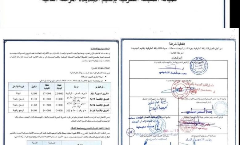 في خطوة استراتيجية تعكس التزام الدولة بتنمية البنيات التحتية وتعزيز الربط بين الأقطاب الحيوية بجهة الدار البيضاء – سطات، تم التوقيع مؤخرًا على اتفاقية شراكة خاصة لتأهيل الشبكة الطرقية بإقليم الجديدة، شملت بالأساس تأهيل الطريق الجهوية رقم 301 الرابطة بين الجرف الأصفر والوليدية، على طول 45 كيلومترًا، بتكلفة مالية بلغت 45 مليون درهم.