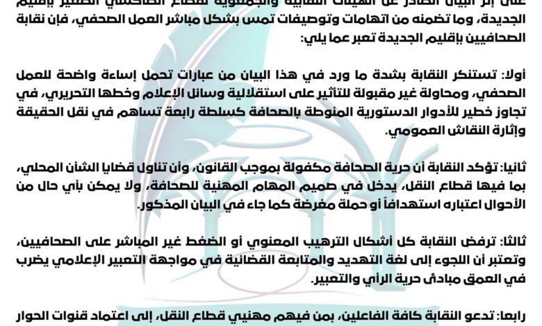 كما عبرت النقابة عن رفضها القاطع لكل أشكال الترهيب المعنوي أو الضغط غير المباشر الذي قد يمارس على الصحافيين، مشددة على أن التلويح بالمتابعات القضائية في مواجهة التعبير الإعلامي يشكل مساسا جوهريا بحرية الرأي والتعبير، ويهدد أسس الممارسة الصحفية السليمة.